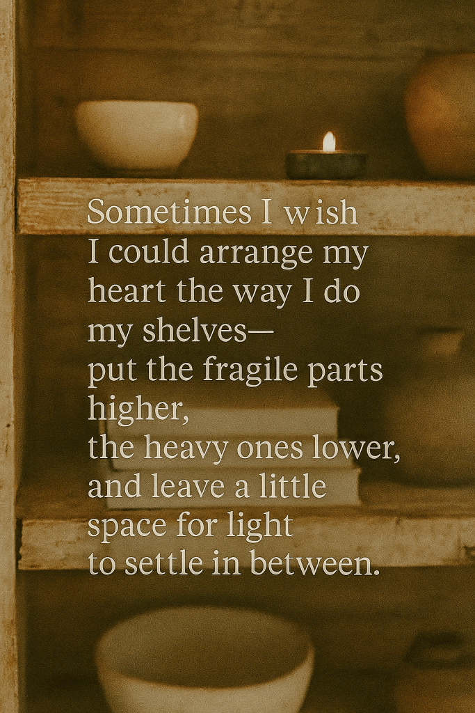 Sometimes I really do wish I could arrange my heart the way I do my shelves. To put the fragile parts higher, the heavy ones lower, and leave a little space for light to settle in between.