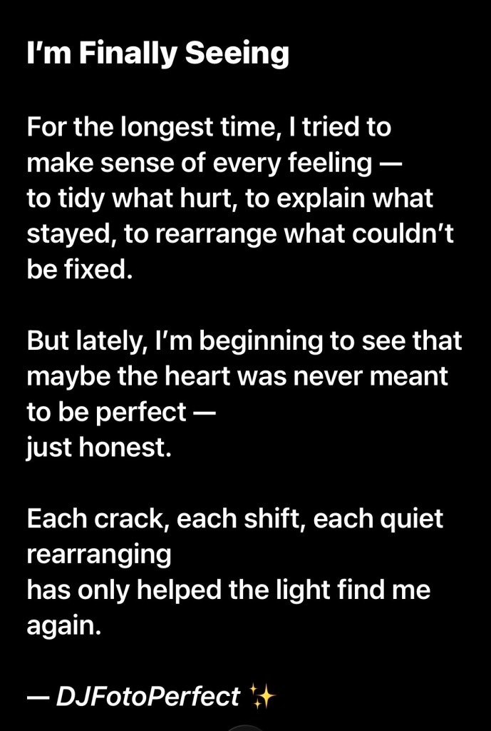 I’m Daisy Jericho. You might also know me as “DJFotoPerfect,” a writer, a feeler, and a quiet observer. Through every line I lived, I left a word behind. This space is where I gather them. Quotes. Sayings. Soft Truths. Saved not just for memory, but for meaning.